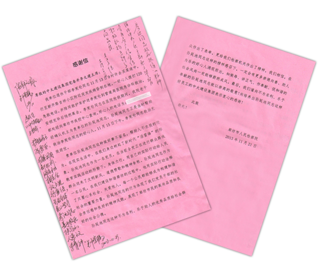 集團公司董事局主席、黨委書記李文健,黨委副書記鐘崇鶴分別在感謝信上做出批示,要求中太建設集團全體員工向孫彥池同志學習,弘揚救死扶傷的人道主義精神。